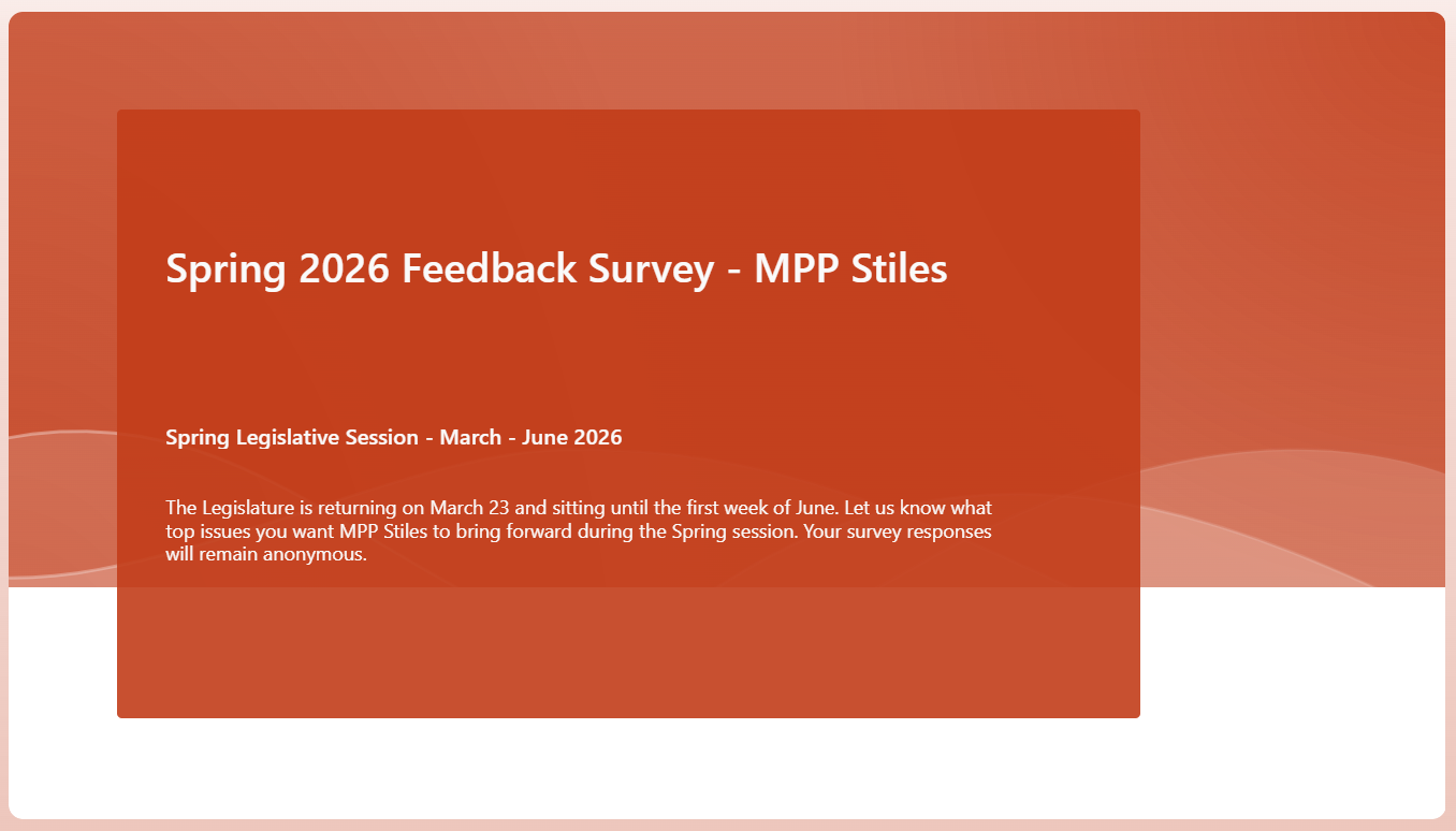 The Spring Legislative Session will begin on March 23 and sit until June. MPP Stiles and the Official Opposition want to know what matters to you and how we can bring these issues to Queen's Park.